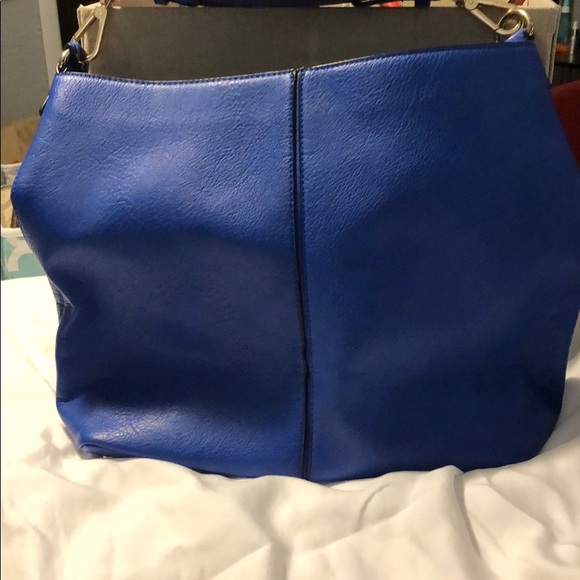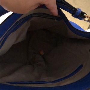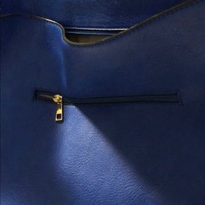 Royal Blue shoulder length handbag with gold hardware. Has a back shipper great place to store your phone along with several zippers and pockets inside. Straps adjust to preferred length.