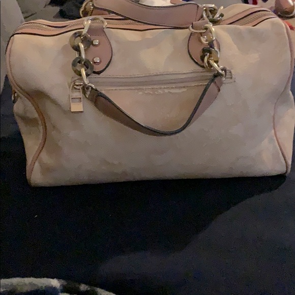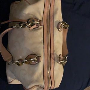 Light tan with dark tan trim gold chains with leather handles one pocket on the outside a 2 small pockets on the inside zippers work perfectly one small scratch on the out side pocket