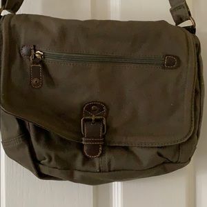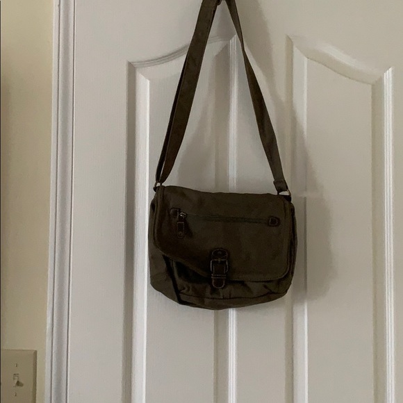 10x11. Green. No stains or rips. Pocket and zip pocket in front comfortable strap