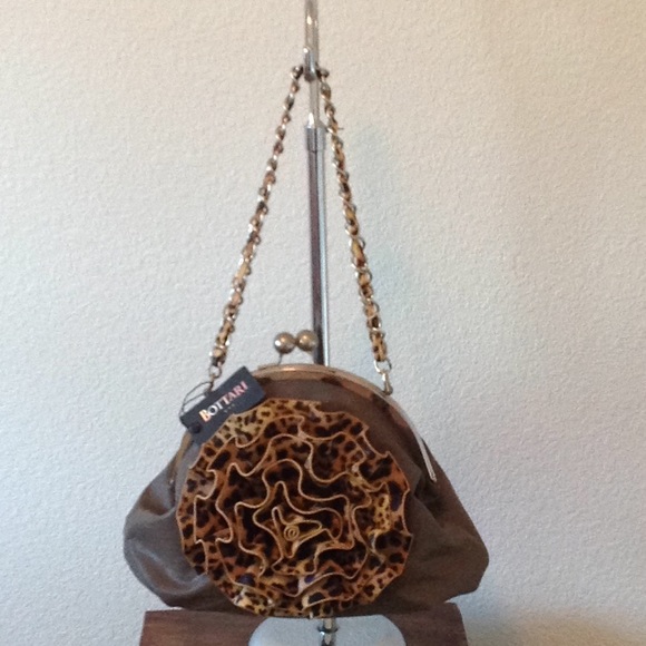 Leather handbag with a cheetah print flower in front. Chain strap. Older bag but never used. Color: Taupe