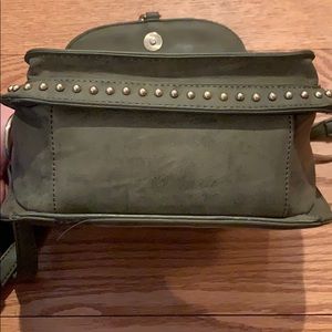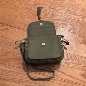Olive green faux leather over shoulder or cross body bag. Faux leather stitching on front with gold studs and accents. Fringe tassel on the front. Front pocket with button closure and the main body has a zipper closure with two interior side pockets.