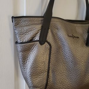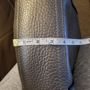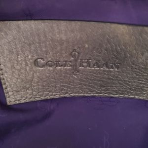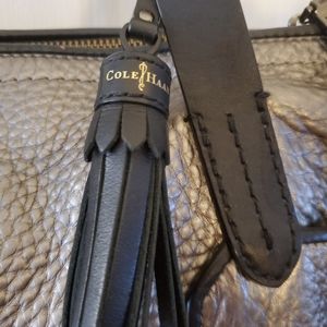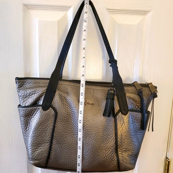 Cole Hann Handbag Pewter Metalic with side pockets. Inside has 2 open pockets and 1 zipper. Some ware on the handle that I was told, by a shoe cobbler, could be repaired. Otherwise the bag is in great condition. Measurements are as indicated by tape. More pictures or questions are welcome.