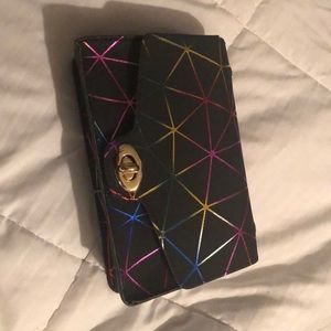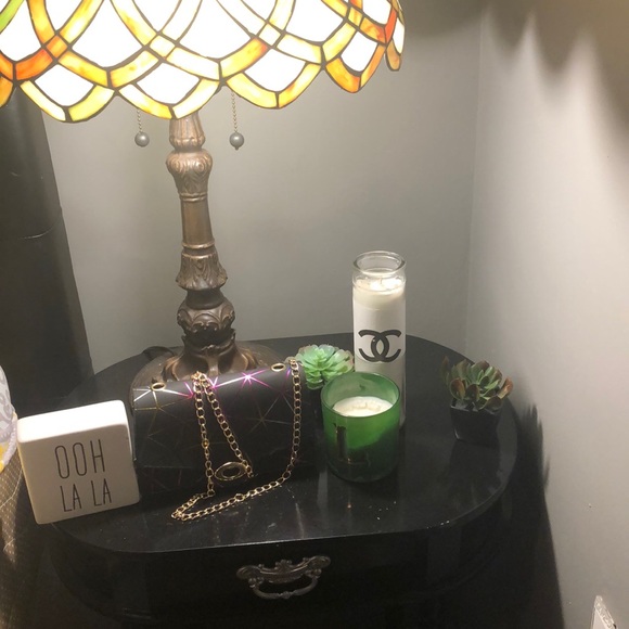It’s electric black hand bag with gold chain purse strap. Can be worn Cross body black with metallic neon colors.