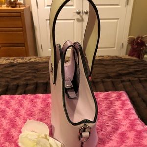 Very unique, light pink bucket style handbag with ivory strap and silver hardware, hardware for crossbody strap but it was lost, still pretty to wear over wrist or forearm, bag is 9 in across, 8.5 in tall, and 4 in deep, 2 snap top closure, 2 interior pockets, 1 zippered, clean interior lining is blk and wht striped. Few small indentations in surface due to storage.