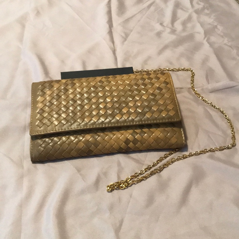 Handbag with gold chain handle.