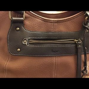 Large brown vinyl handbag with dark brown handles and accents. It has many pockets. Outside zipped pocket, center snap top inside, middle zipped pocket separates sections on either side. One side includes flat zipped pocket. Other side has 2 small openings, one of those has snapped flap. In other words, you will never remember where you keep anything! No, you will be very organized!!