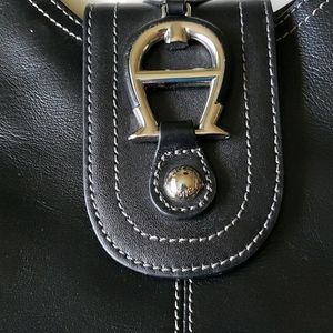Etienne Aigner Black Leather Handbag 14" wide by 9" tall. White stitching with chrome hardware. Two exterior side pockets. Interior has one center pocket divider. Purple lining. Never used. No smoking no cat house.