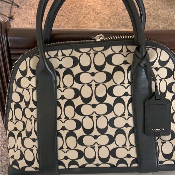 Authentic Coach handbag Colors are beige and black. Zip closure bag has a stain on it but it’s shown on the picture.