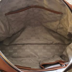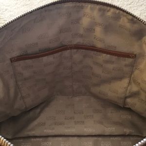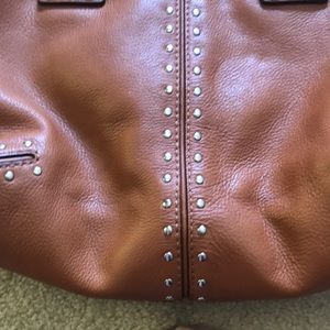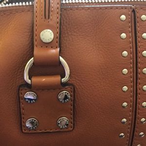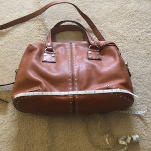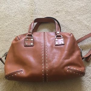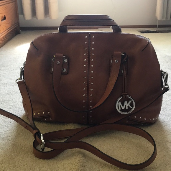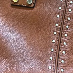 Michael Kors leather tan color. A little stains inside can be wipe off other than that its clean. Small stain in the leather (see pictures) can be wipe off with leather cleaner. Detachable and adjustable strap with 5 holes for adjustment with silver hardware. All the studs are intact. Can be use handbag or cross body. Gently used, smoke free