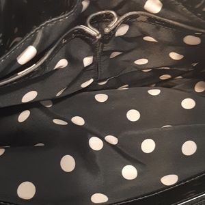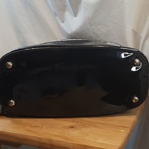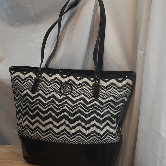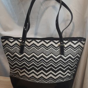 Black and white patent leather satchel bag with straw zigzag mesh body. Inside full length zip pouch and one side zip pouch 2 pocket pouches for cell and keys. Top snap magnetic closure. Bottom sit knobs. Perfect with these Antonio Melani pumps perfection!!!!