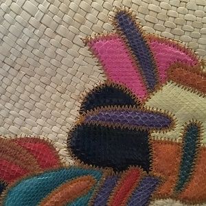 Straw and alligator skin design of different colors. Clutch or shoulder strap which is 46" long. Inside lined with 1 zipper pouch. Like new, never used. Made In Philippines.