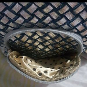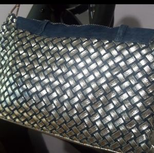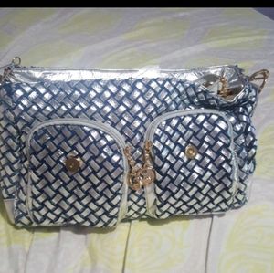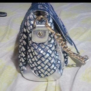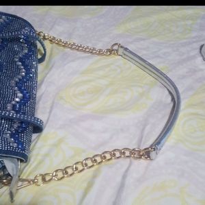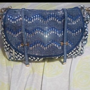 Blue and silver bejeweled handbag. The blue is actually like blue jean material braided with the silver. Front flap filled with baguette blue and silver stones. And all over with small silver stones. Short strap can be removed to use the long strap. 1 zippered divider pocket in middle of bag dividing into 2 sections. Another zippered pocket and 2 slip pockets inside. And 2 zippered pockets outside of bag. Gorgeous and roomy.