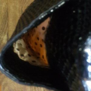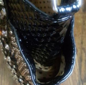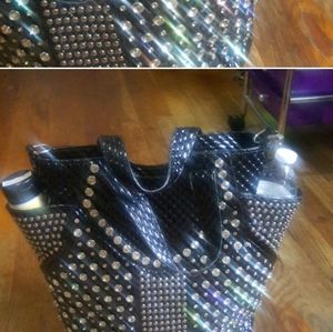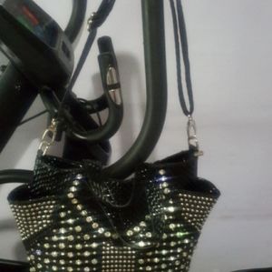 Black gorgeous bejeweled bag throughout the whole bag. Zippered pocket on back. On the sides w deep pockets as shown in pic. I placed 2 items to show. Long strap comes with bag. Inside 2 zippered pockets. 3 open slip pockets. And zippered opening to get in bag. Height 13" length 13" width 4". In good condition.