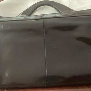 Sexy black clutch bag for days or evening 12 inches by 8 inches . Half moon handles with small shoulder straps 6inhes. Inside has pocket with zipper and eight slip for cards . Line in dark gray silk