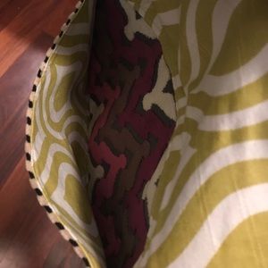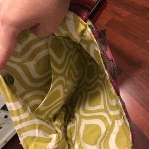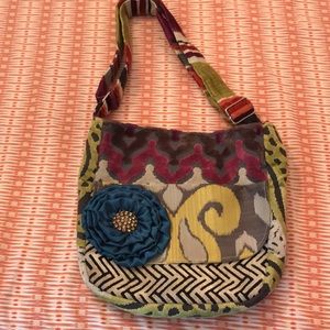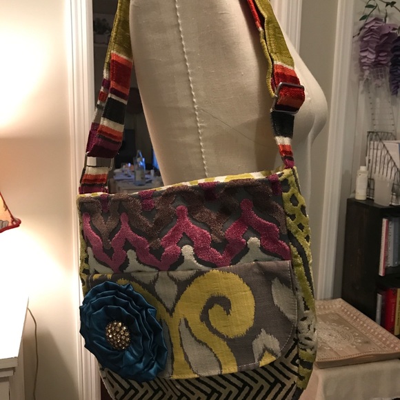 Multi color and pattern handbag. 11” wide by about 12” long. Adjustable shoulder strap. The blue flower is removable.