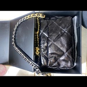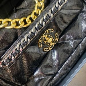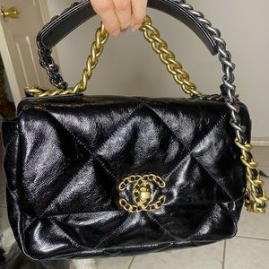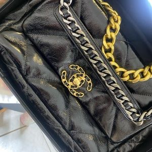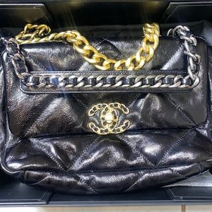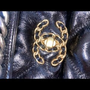 Medium sized handbag with gold and silver chains.