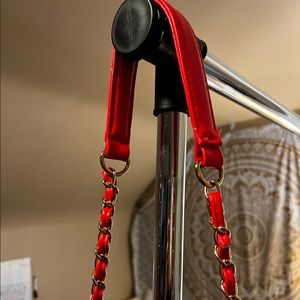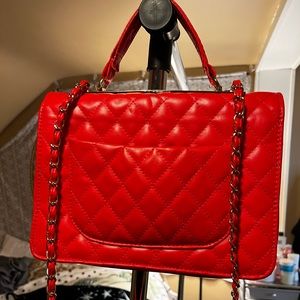 Red handbag, like new condition, with long strap and handle strap, 3 compartments inside, 1 large zipper pocket inside