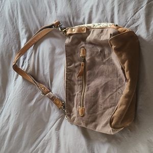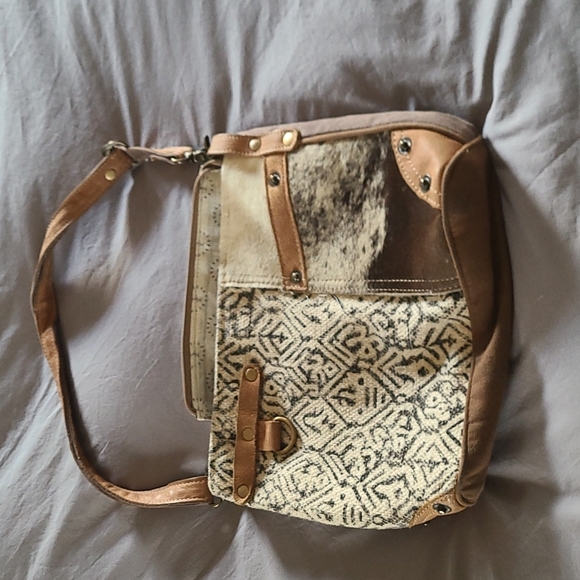 This is a Myra bag with canvas, leather and cowhide. the single leather strap can be used over the shoulder or as a crossbody. It has an inside zipped pocket and also one on the back of the bag. The bag also has an open pocket almost the height of the bag on the front. The bag is 11 inches tall and 13 inchrs wide.