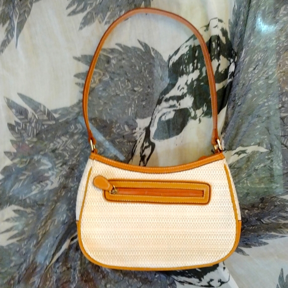 Cream colored bag with brown trim. Gold hardware. super clean inside with places for if, keys, cards etc. Green interior and in Excellent shape. Cute purse for a beach brunch!