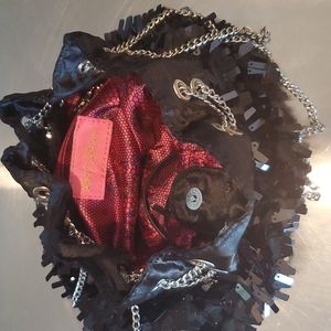 Super cute Betsy Johnson pouch style handbag. Great accessory for night out. Satin material with rectangular type sequins sewn on. Silver chains for straps. 9" x 9" when filled. Holds smartphone plus wallet and a few makeup items. Closes drawstring style with the silver chains. Awesome condition!