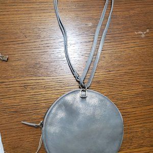 Brand new round leather crossbody handbag. Gold shimmer color. It's a round shape, 7.5 inches diameter. Comes with dust bag. 28 inch strap that can be doubled up for a shorter length.