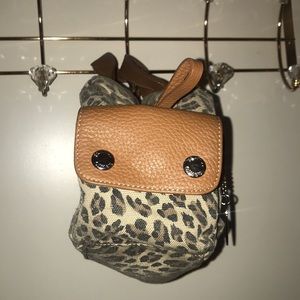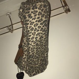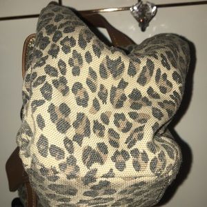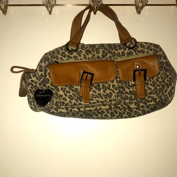 Handbag leopard print cloth canvas bag with 3 exterior pockets one hidden zipper compartment in the front 3 compartments inside. Slight discoloration on inside.I Take offers too.