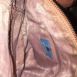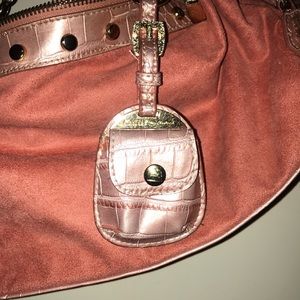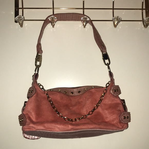 Handbag is faux leather, has studs, a decorative gold chain. Used a couple of times but in good condition zipper is stiff does not move easy has not been used much,has a mini coin bag connected to it. Inside of lineing of bag it has a stain where zipper compartment is located.