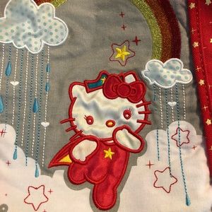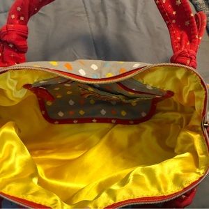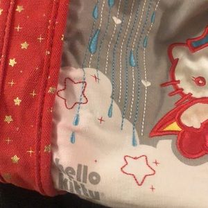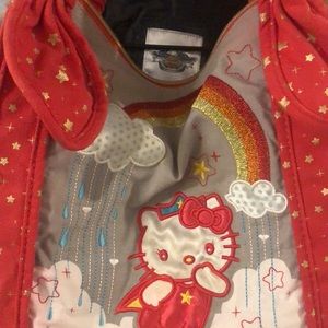 Hello Kitty purse with plenty of room for all your things. Lined in bright yellow satin with two inner pockets, one zippered and one Velcro. Light gray background, red handles, white, orange, yellow and blue print. Bag is 19 inches by 10 inches. Good used condition for this rare bag! Slight flaw of red coming onto white but it’s very hard to notice unless you’re looking for it, see last 4 pics