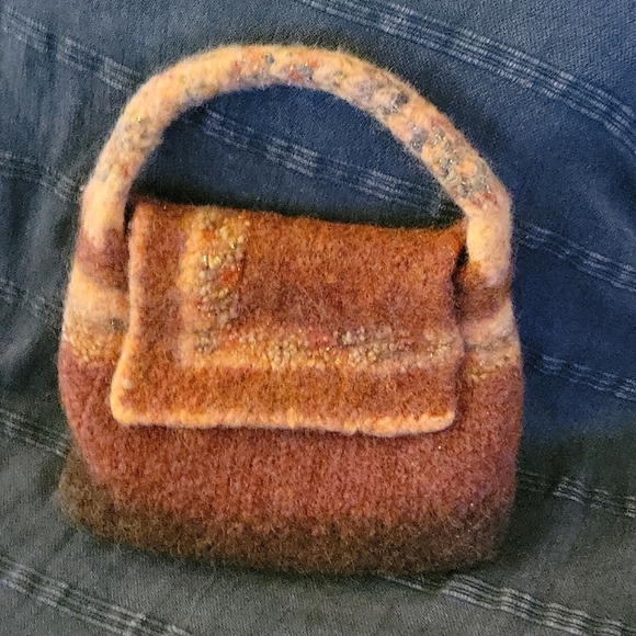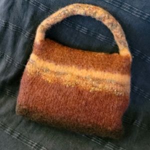 hand knitted, felted, small hand bag, brown, gold, red, orange, gently used