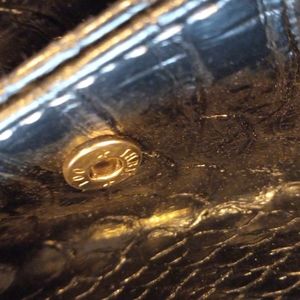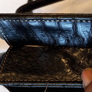 vintage embossed faux leather snakeskin 2 straps purse, triple compartments, zip closure, zip pocket inside, 3 slip slots, 6 cards holders, ID, 2 separate snap compartments, tan top stitching, see pink lining, left side in the fold there's a small slit or crease? not noticeable, not big, see details, see pics, pre-owned, pre-loved condition.