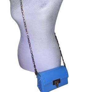 Light blue plastic material purse with gold chain and clasp. Offers welcome.