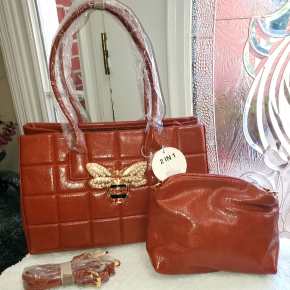 Beautiful handbag made out of Vegan, brand new, tan color also have a little side purse goes with it. Just Adorable!!!!