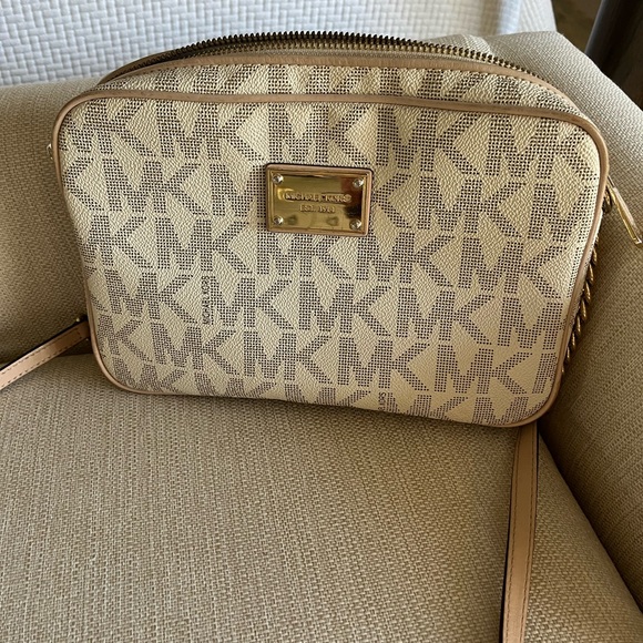 Michael Kors shoulder bag. Cream and tan in color. Adjustable strap. Great condition and very clean