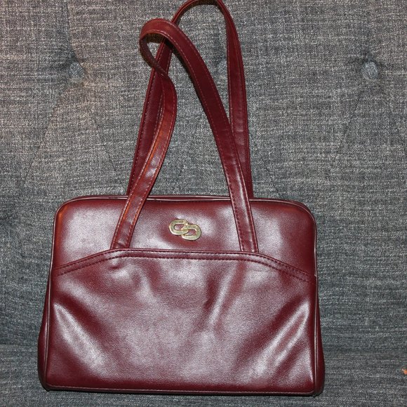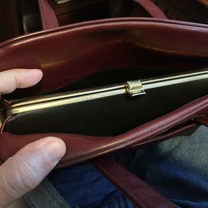 Cranberry color purse. Exterior pocket, two interior pockets for quick access; a snap close purse in the middle. Very good condition; like new. Approx. 12'' by 9''