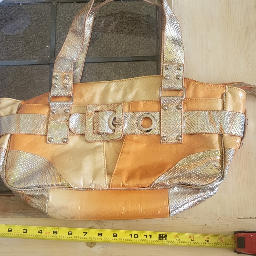 I am struggling with selling this one! One of a kind orange and silver bag with metalic reptile accents. I really love this zipper closure bag.