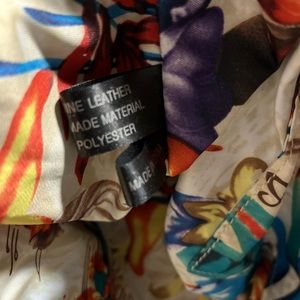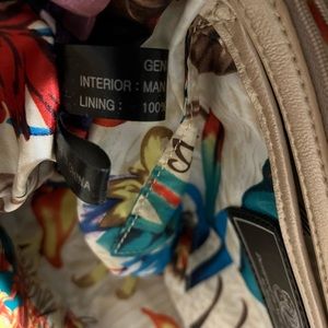 Cannot find strap but has clean handle. No discoloration. Beautiful studs on making the cover heavier. Smoke free home. Storage bag included.