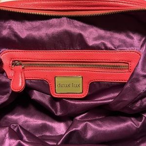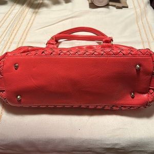 Woven leather handbag with purple satin interior. Adjustable snap closure at the bottom allows bag to be made bigger