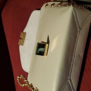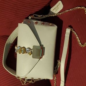 Tan leather handbag with 2 detachable straps. Sophisticated hardware. Decorative applique. Never used and in immaculate condition. 9" long, 61/2" tall, 3" thick