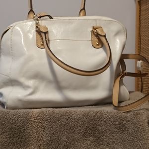 white, patent leather sachel handbag/purse with tan straps, inside zipper pockets, 4 inside fabric lining pockets, 1 outside pocket, good condition