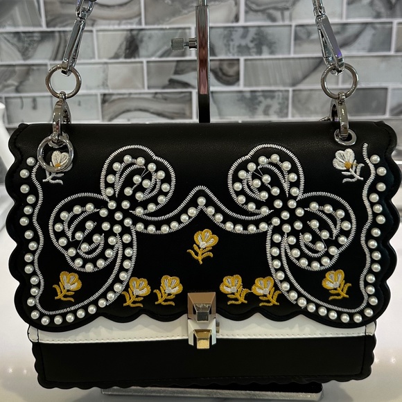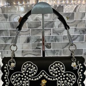 This handbag is black leather with embroidered flowers and stitching, and outlined in pearls. The scalloped edge front and back makes this an eye catcher. Hardly used, in excellent condition.