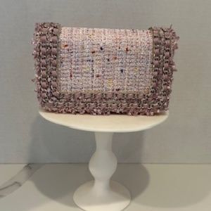 This bag is covered in fabric that looks and feel like the fabric Chanel manufactured skirts in a few years ago. Trimmed in pink leather/silver chain. The chain can be used as a shoulder bag, or remove the chain to use as a clutch. Bag has a snap closure.