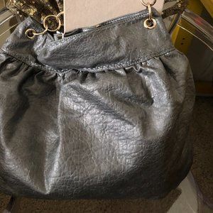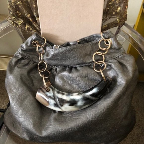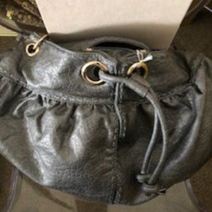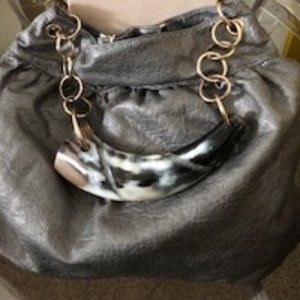 Leather handbag with tusk handle (marble design), gold rings accents and drawstring. Like New Condition