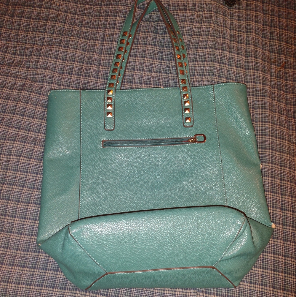 this is a very rich turquoise blue leather studded bag has a red liner pocket inside very nice bag like new very soft leather and silver studs on the handles