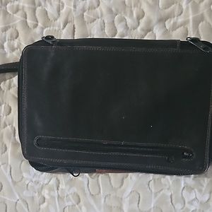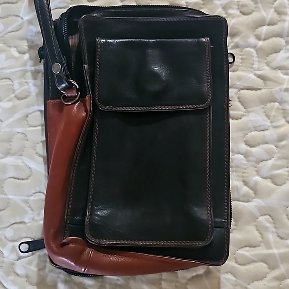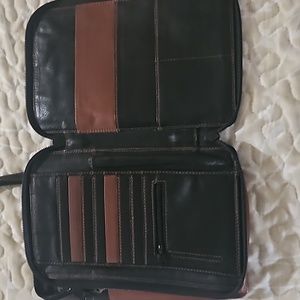 Black and tan leather large wristlet. On ouside has cell phone pocket with magnetic closure, opposite side has zippered compartment. Inside has slots for credit cards, cash and zippered coin spot. Other compartment is large enough for glasses, lipstick, etc.