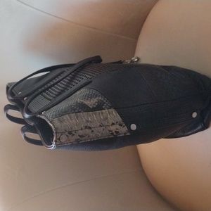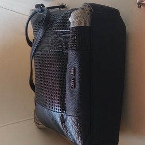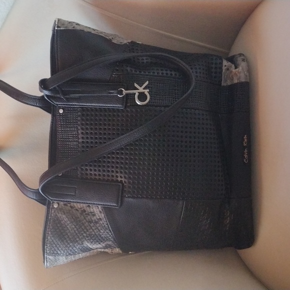 Calvin Klein shoulder tote bag. approx 12" h x 13" wide, x 2" deep. with handles up approx "22" tall. 1 zippered pocket inside and two open pockets. 1 small outside pocket maybe for ID card.. Blk leather material some gray accents like snake skin designs with a few silver tone buttons on sides. approx 8 yrs old. new pretty much I only used a few times. I'm more into smaller bags so my big bags just sit