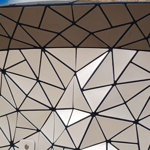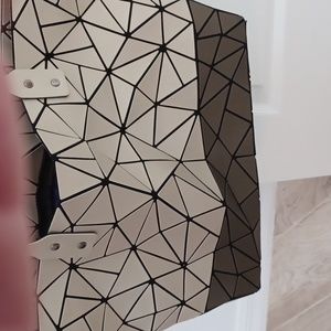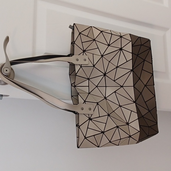 P. Luca brand. 16" x 11" x 4". Bag is beige & brown vinyl with a metallic look, with black in between the triangles. Zip clise across top. 2 straps are 24" (12" drop). Can be worn over arm or shoulder. Inside is dark purple satin-y material and has a zipper compartment. Excellent condition. Purchased in Bloomingdale's.