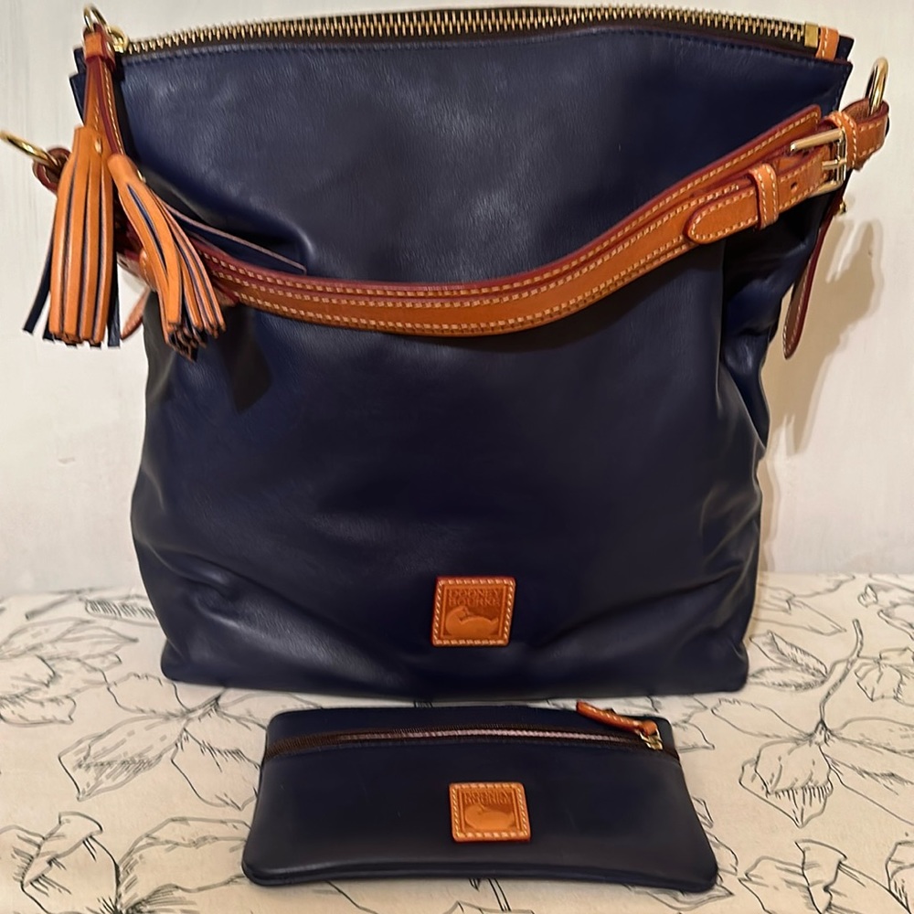 Dark Navy Florentine leather hobo bag with matching pouch (credit card slots). Butterscotch trim. Approx: 13”L x 15”W. Interior: 1 zip pocket, 3 slip pockets, Key fob. Bottom w/ feet. Used once. Tag inside purse: J12674111