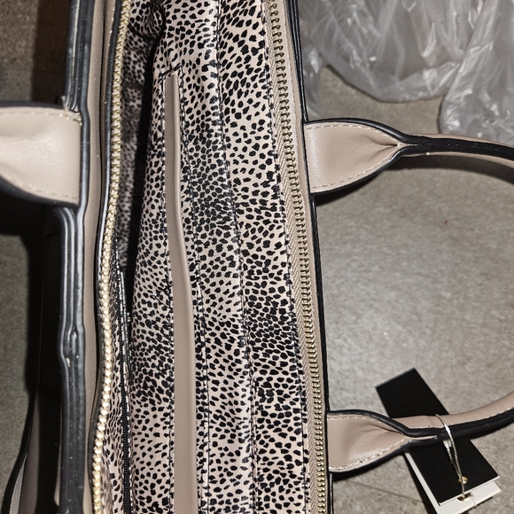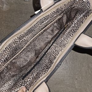 This satchel has lots of room for your essentials. There is a top zipper closure and a zipper on the inside and 2 pockets on the inside. The color of the handbag is closest to Taupe.