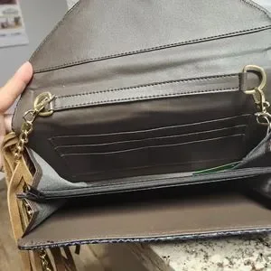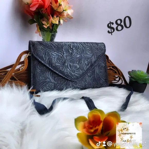 Beautiful envelope type bag made with genuine leather and chiseled on the back. You can use it as an envelope under your arm or on your shoulder with an adjustable strap. It has internal compartments.