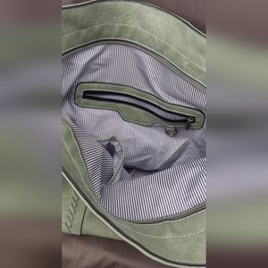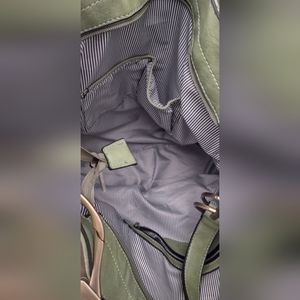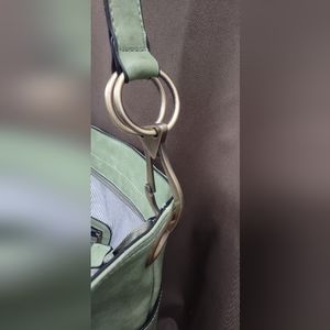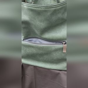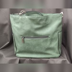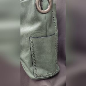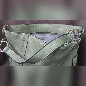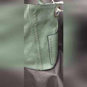 Faux Leather Sage Green Handbag. Nice Goldtone hardware and Striped lining. Nice outside pockets on side and ends, inside has 2 open pockets and 1 zipper pocket. Nice braided detail on front. Soft and NWOT